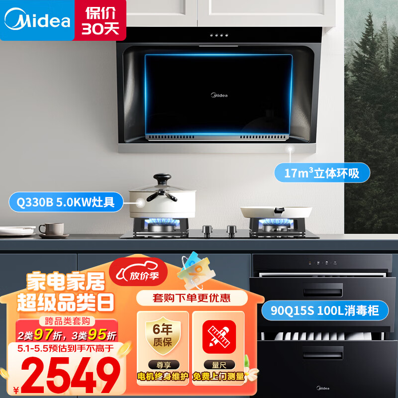 美的(Midea)抽油烟机侧吸17m3大吸力油烟机台嵌两用双灶天然气灶具100L消毒柜厨房三件套J30+Q330+90Q15S价格:2549.00元!