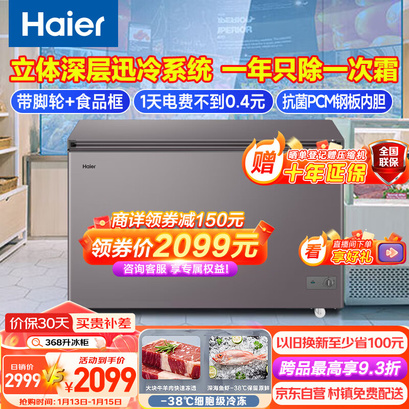 海尔368升低霜卧式商用家用冰柜 商用大容量冷藏柜冷冻柜冰柜家用大冷柜BC/BD-368GHPCD以旧换新价格:2249.00元!