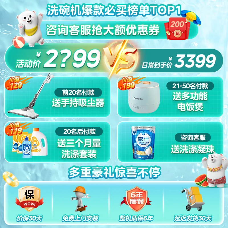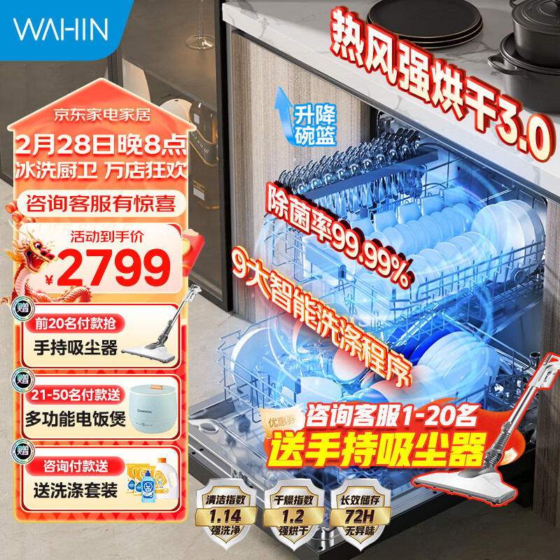 华凌14套容量洗碗机 嵌入式三层喷臂劲洗热风烘干智能油污检测 高温除菌全自动家用刷碗机AIR8价格:2799.00元!