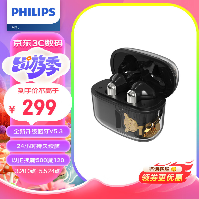 飞利浦(PHILIPS)真无线蓝牙5.3手机通话降噪运动跑步重低音音乐耳TAT1168黑色价格:299.00元!