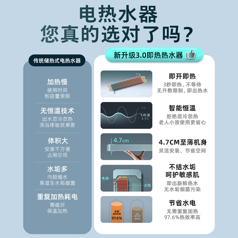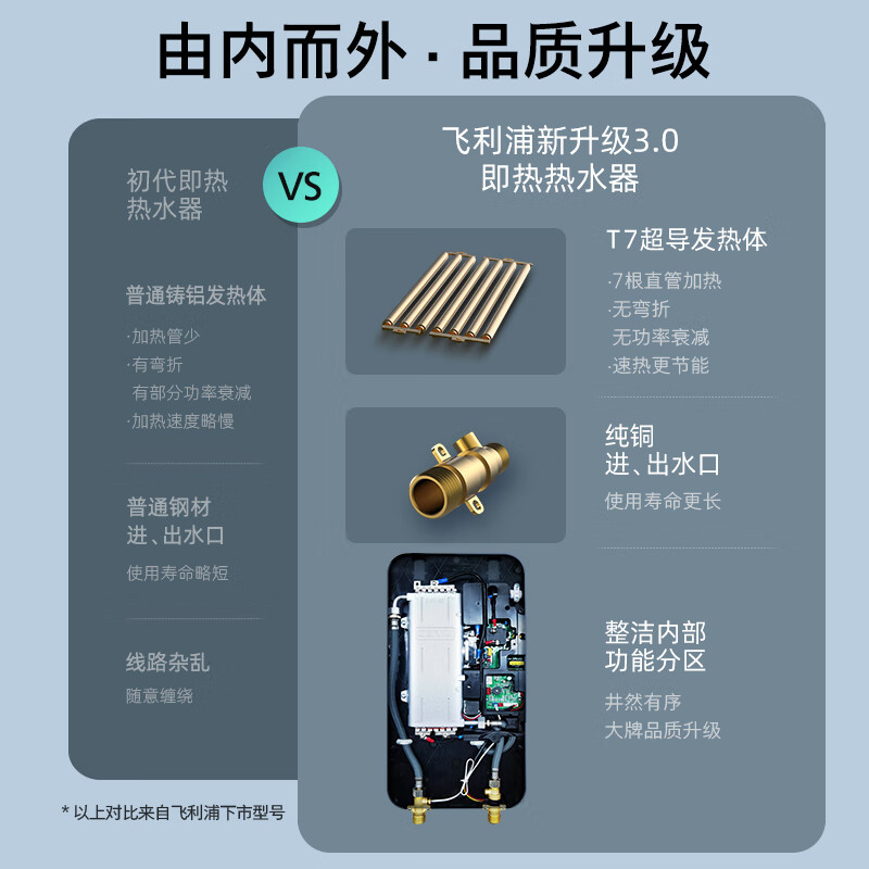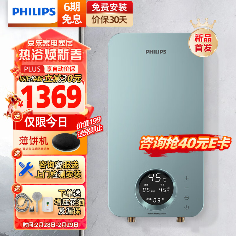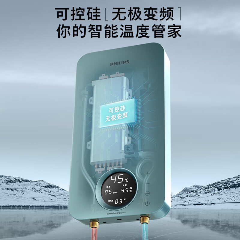飞利浦(PHILIPS)即热式电热水器 电即热8500W速热无极变频智能恒温无胆免储水淋浴洗澡水电分离 石砾青系列AWH2400价格:1569.00元!