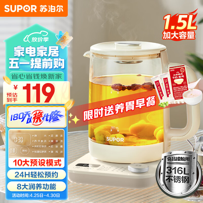 苏泊尔(SUPOR)1.5L大容量养生壶煮茶器煮茶壶316L不锈钢电水壶保温恒温花茶壶烧水壶智能旋控SW-15YT12B价格:119.00元!