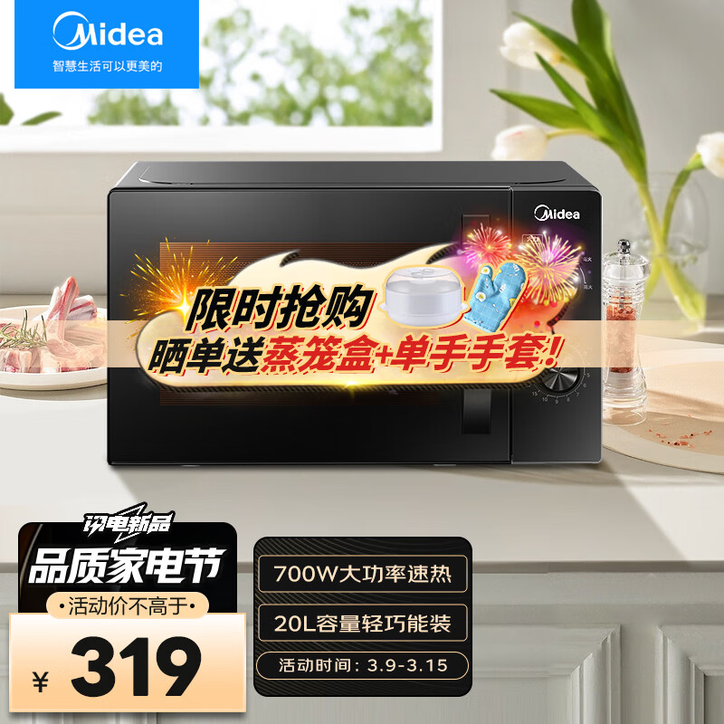 美的 MIDEA快捷微波炉 家用小型 360°转盘加热 专业防火面板 旋钮操控 易洁内胆 侧拉门 20L M20C[黑色]价格:319.00元!