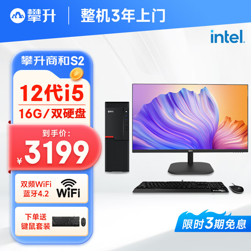 攀升商和S2 办公商用台式电脑主机(i5-12400 16G 256G+1TB WiFi 键鼠 3年上门)27英寸整机diy组装机价格:3199.00元!