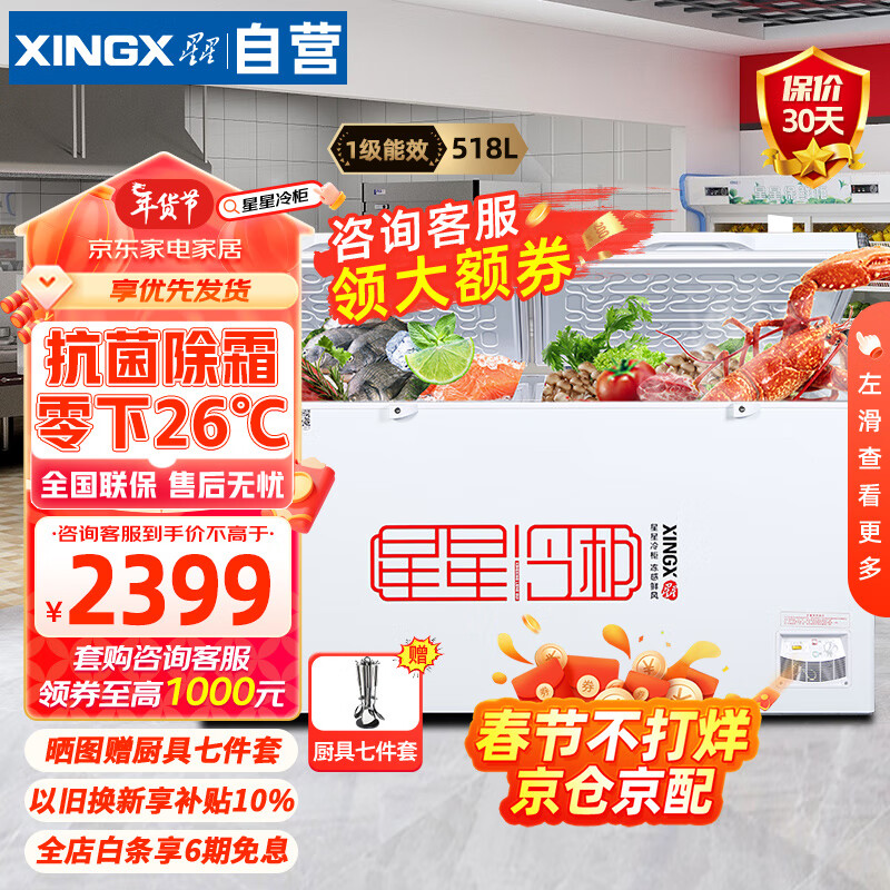 星星(XINGX)518升卧式单温冰柜家商用冰柜冷藏保鲜强劲速冻超市大容量冷柜1级能效 防菌除霜 BD/BC-528GE价格:2399.00元!