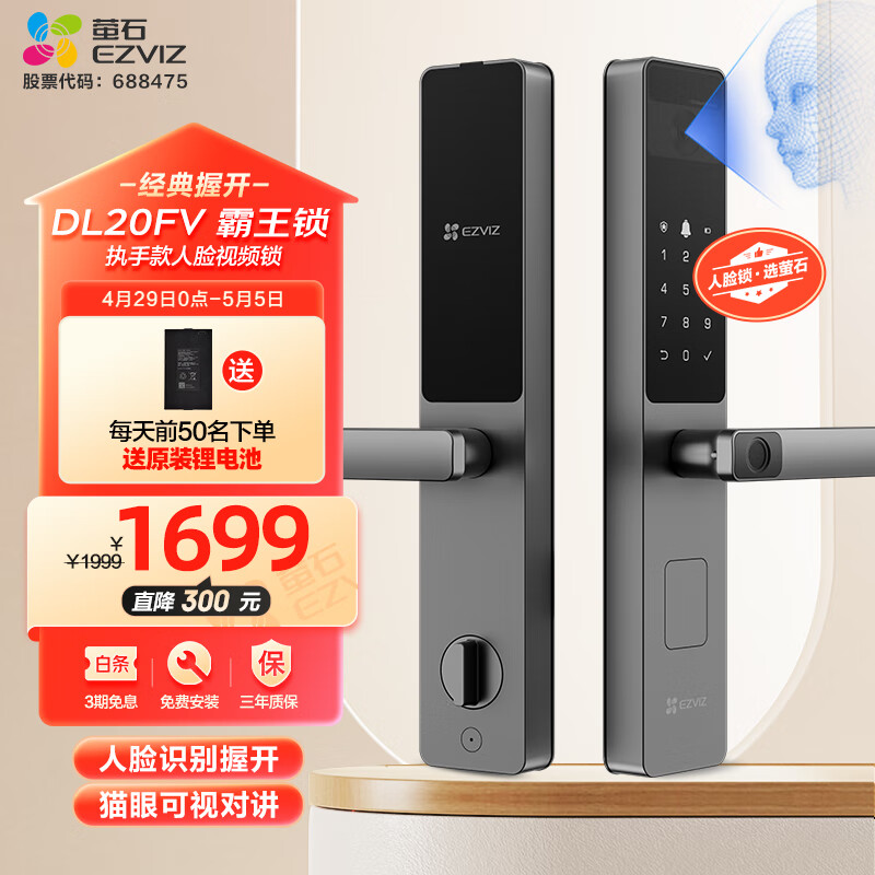 萤石DL20FV智能人脸视频锁 霸王锁 3D人脸识别指纹握开式视频锁 家用全自动智能猫眼门铃防盗电子门锁价格:1699.00元!