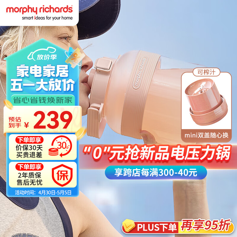 摩飞电器(Morphyrichards)榨汁机 榨汁桶便携榨汁杯无线充电果汁杯随行杯1升容量户外果茶冷泡桶迷你小胖吨MR9805 Nano版 粉价格:239.00元!