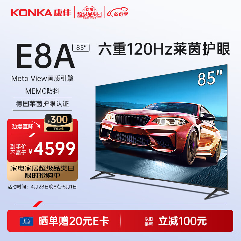 康佳电视 85E8A 85英寸 3+32G 120Hz MEMC护眼电视 4K超清屏 液晶平板电视机巨幕大屏 以旧换新价格:4299.00元!