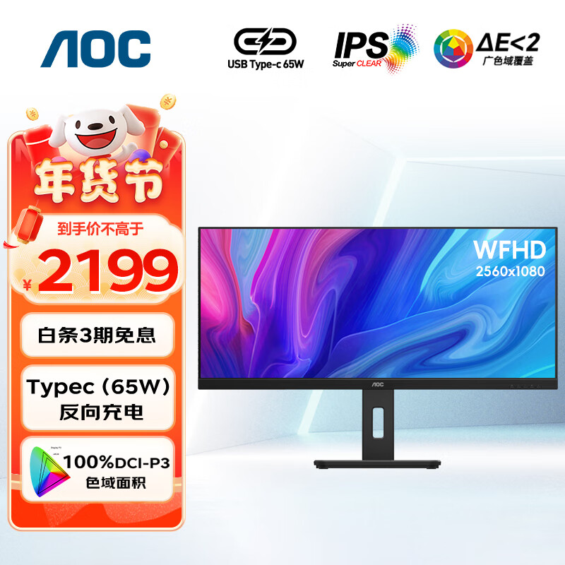 AOC 34英寸 WFHD 21:9带鱼屏 IPS技术 123%sRGB色域 Type-C 65W反向充电 家用办公电脑显示器 Q34P2C价格:2199.00元!