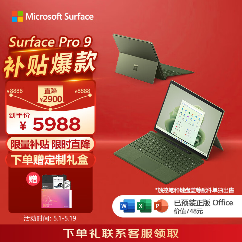 微软Surface Pro 9 二合一平板电脑 i5/8G/256G 森野绿 13英寸高刷触控 学生平板 轻薄本 笔记本电脑价格:5988.00元!