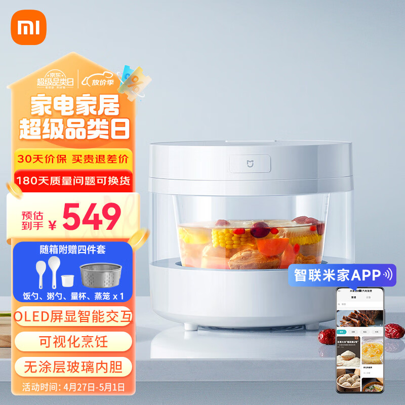 米家小米电饭煲家用3-4个人/5-8人 多功能电饭锅煮饭锅煮粥锅 无涂层玻璃内胆 蒸煮可视 大容量4升价格:549.00元!