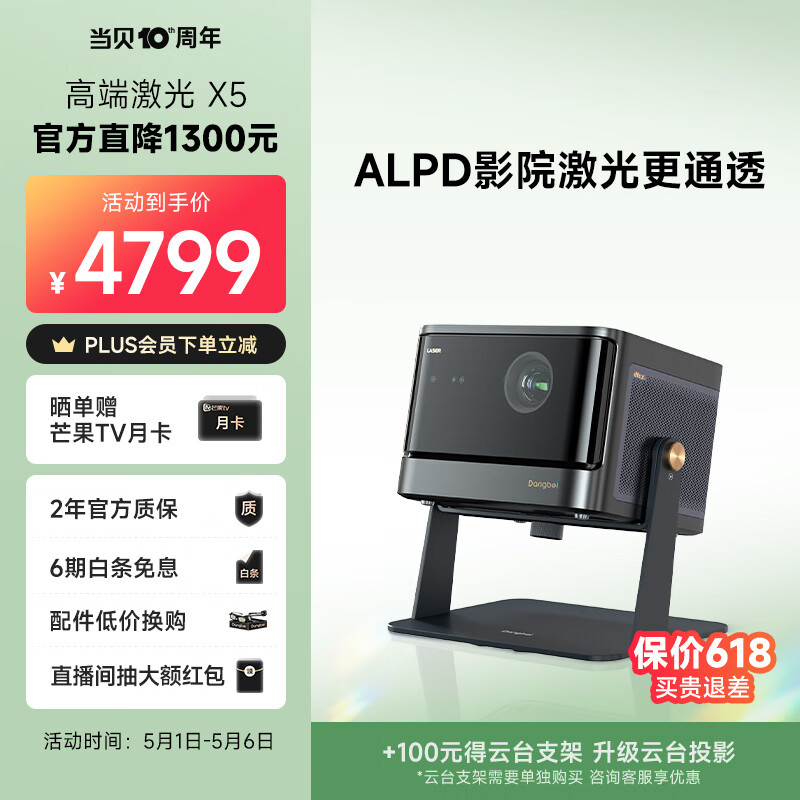 当贝 X5 激光投影仪家用 游戏投影机(ALPD影院激光无散斑 2450 CVIA流明 MT9679全新大师芯片4G+64G)价格:4799.00元!