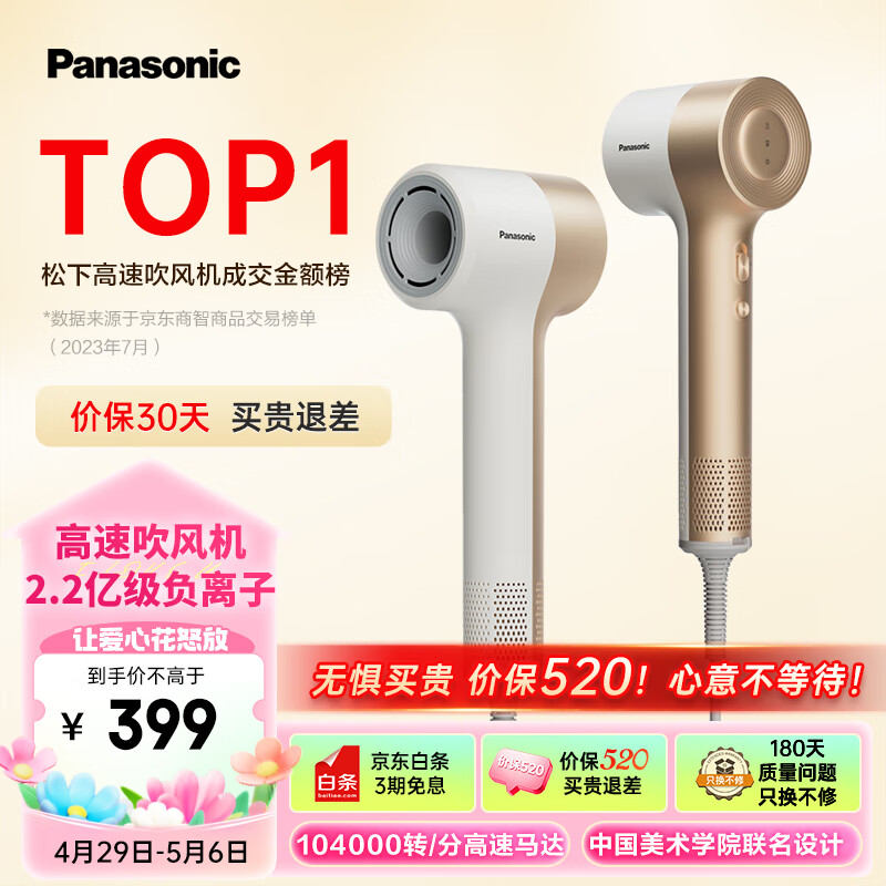 松下(Panasonic)缤纷筒高速吹风机负离子低噪音大风力家用新年礼物电吹风速干护发家用大功率吹风筒NE7H达芬奇白价格:348.60元!