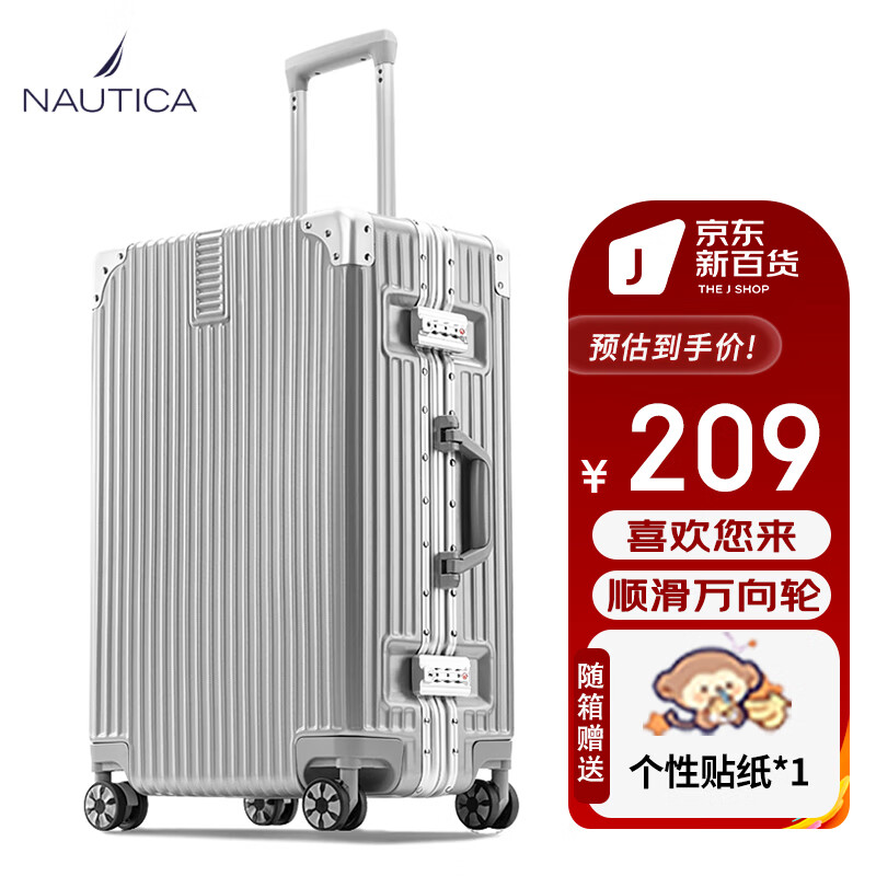 NAUTICA铝框行李箱男万向轮结实银色拉杆箱24英寸大容量女旅行箱密码箱价格:209.00元!