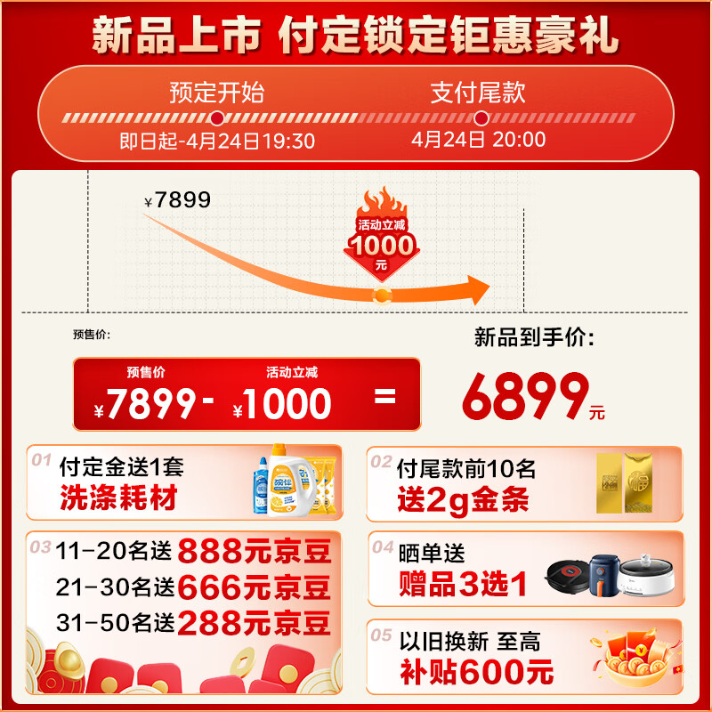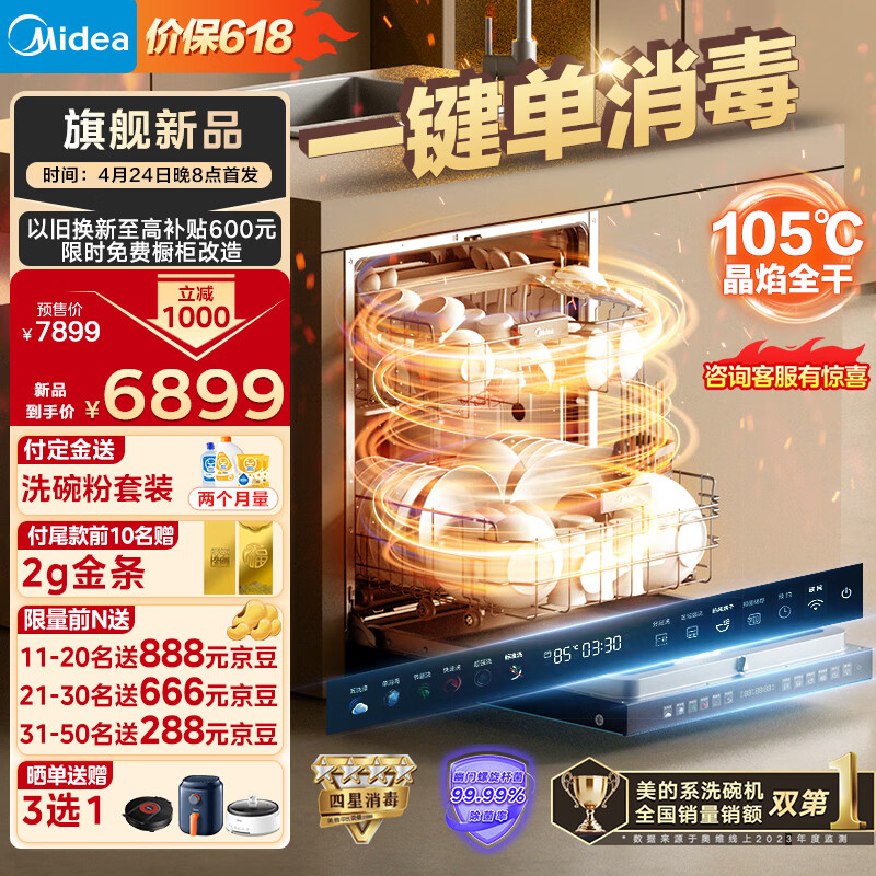 美的(Midea)16套嵌入式洗碗机晶焰星河M9 五臂飓风洗一键单消毒变频四星消毒105℃热风烘干168h存储价格:7899.00元!