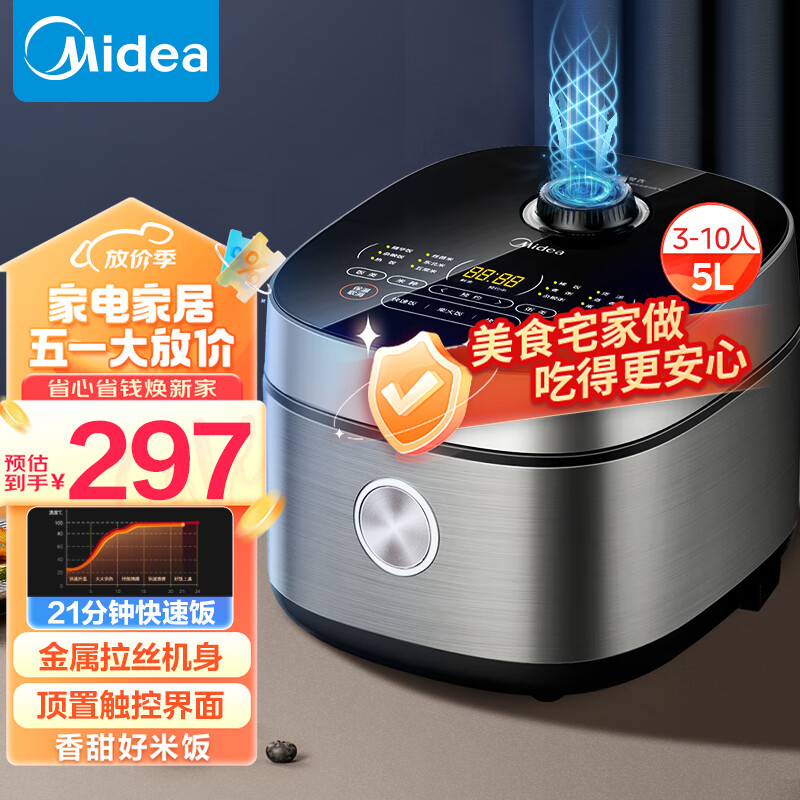 美的(Midea)飞快系列 智能电饭煲电饭锅家用5L大容量聚能釜破泡防溢多功能蒸煮米饭锅50Q1-401J(3-10人)价格:297.00元!