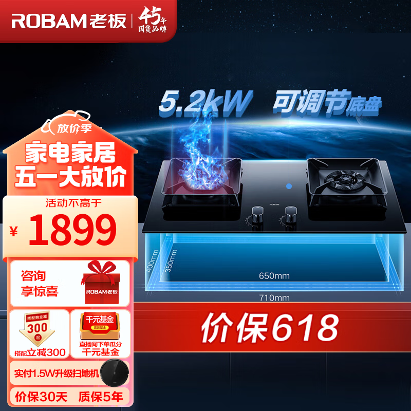 老板(Robam)燃气灶57B5X家用5.2kW超大火力68%高热效【王一博同款】易打理嵌入式可调节底盘 一级能效 5.2kW可调节天然气价格:1899.00元!