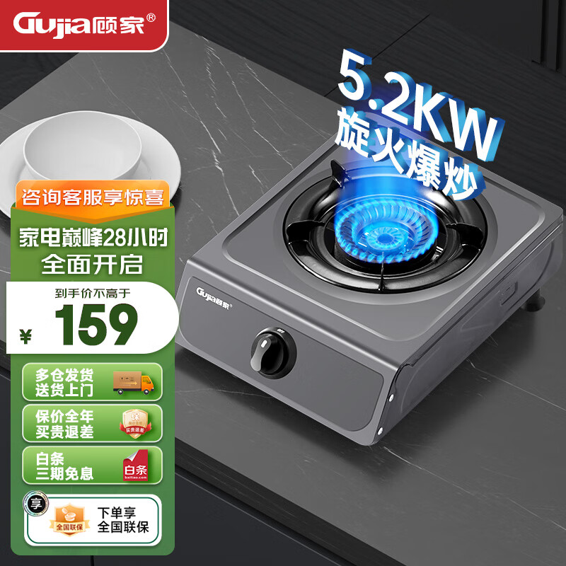 顾家(Gujia)燃气灶单灶煤气灶家用台式5.2KW大火力猛火节能黑色耐脏单眼炉具JZT-DT1(天然气)价格:219.00元!
