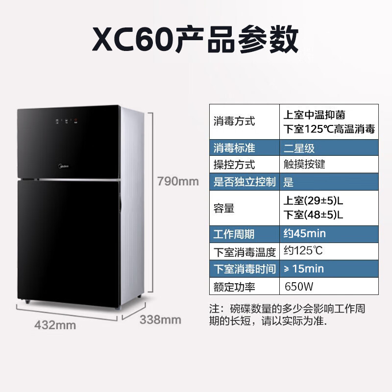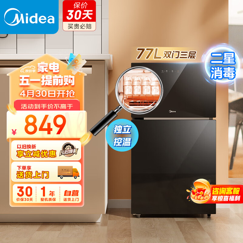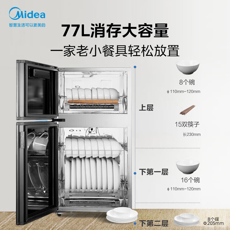 美的(Midea)消毒柜家用 立式 厨房餐具碗柜碗筷茶杯茶具 77L三层双门 小型智能 高温 二 XC60价格:849.00元!