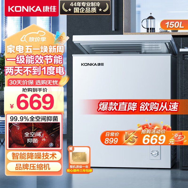 康佳(KONKA) 150升小型冰柜家用商用冷藏冷冻转换 单温母婴母乳小冷柜 一级能效 BD/BC-150DTH价格:669.00元!