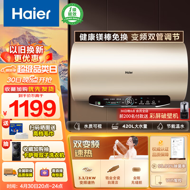 海尔(Haier)60升【金刚无缝胆】3300W变频大功率速热电热水器家用储水式大水量免换镁棒一级能效 EC6002-JT3U1价格:1199.00元!