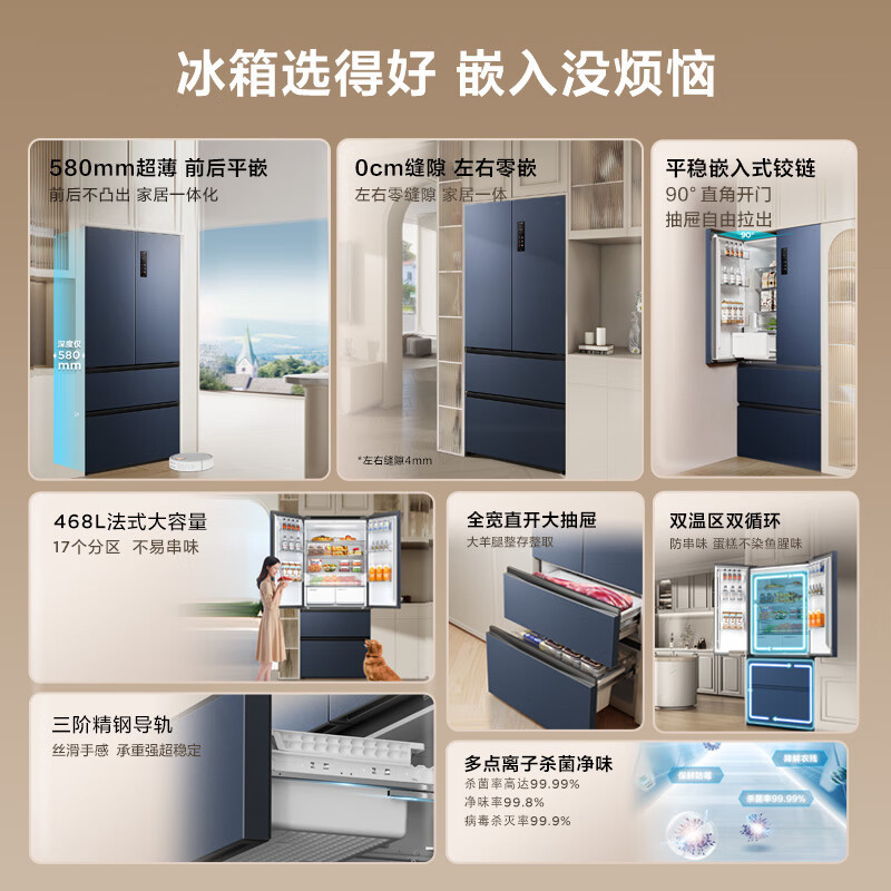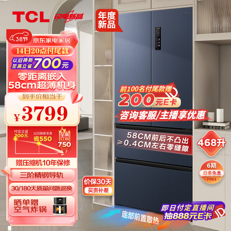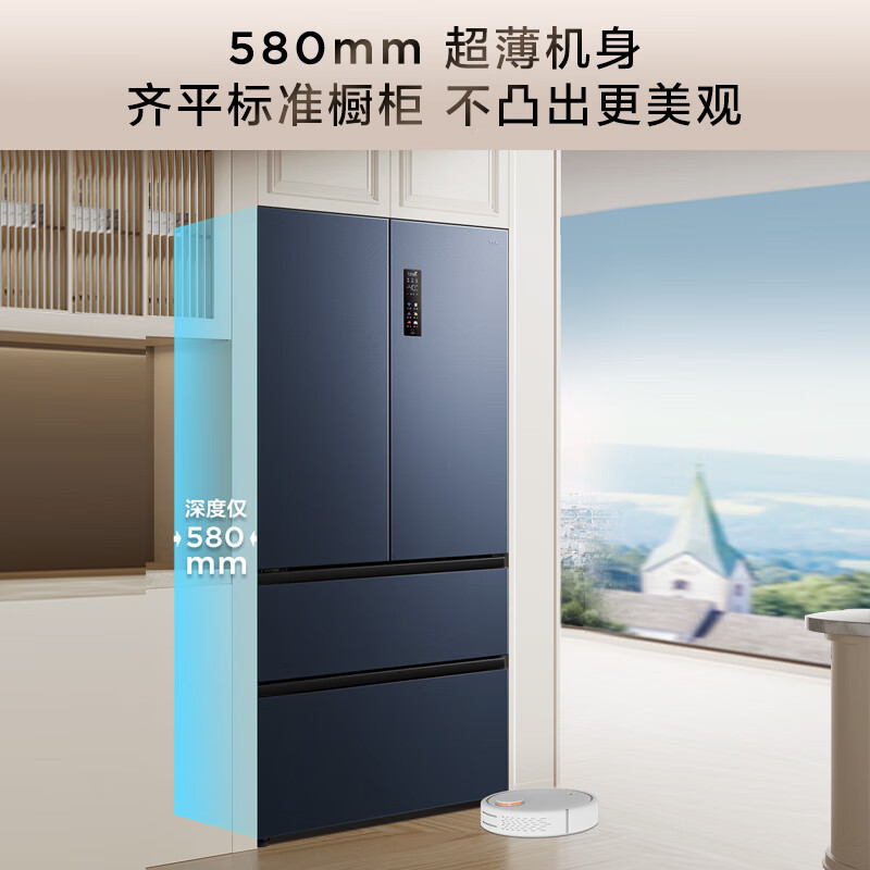 TCL 468升T9法式四门58cm超薄嵌入式冰箱 杀菌除味双循环 一级能效 风冷无霜 家用电冰箱R468T9-DQ价格:3799.00元!
