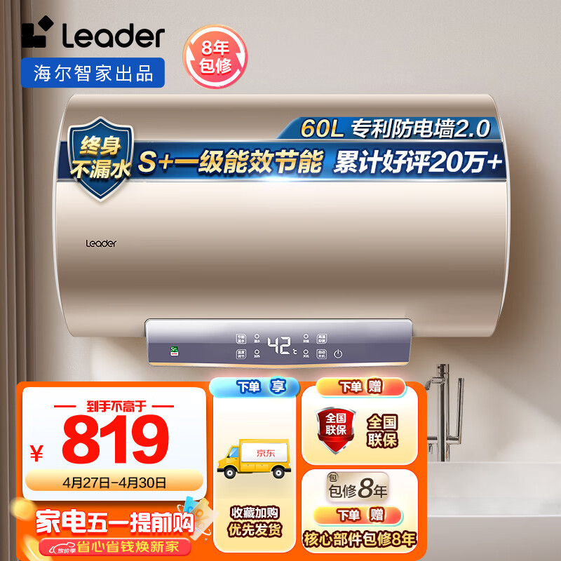 海尔智家出品Leader 60升电热水器家用储水式 速热大水量一级能效节能 LEC6001-LD5金【以旧换新】价格:1119.00元!