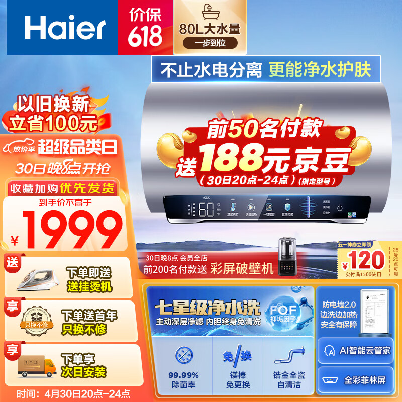 海尔(Haier)80升【金刚无缝胆】美肤净水洗彩屏电热水器家用储水式3300W变频大功率速热一级能效 EC8002-JH7U1价格:2199.00元!