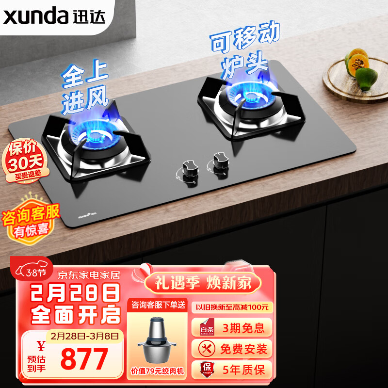 迅达(XUNDA)燃气灶液化气灶家用 煤气灶双灶具 嵌入式台式两用 4.1KW旋流猛火灶 可拆卸炉头 FJ2-液化气价格:977.00元!