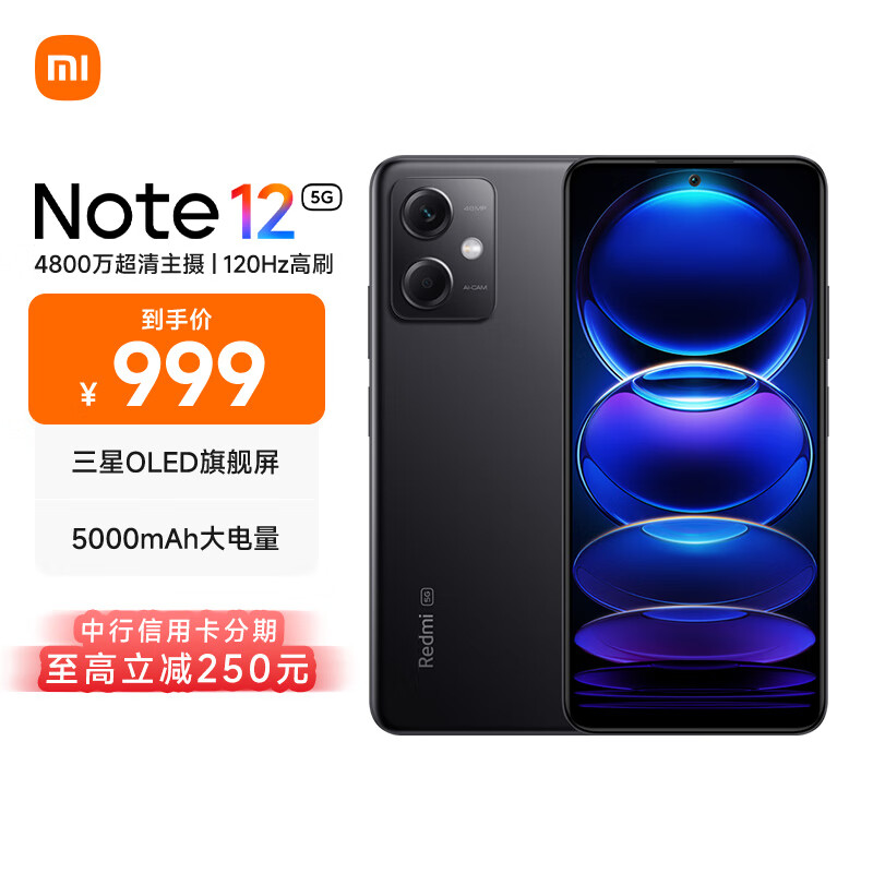 小米(MI)Redmi Note12 5G 120Hz OLED屏幕 骁龙4移动平台 5000mAh长续航 8GB+256GB子夜黑 小米红米价格:999.00元!