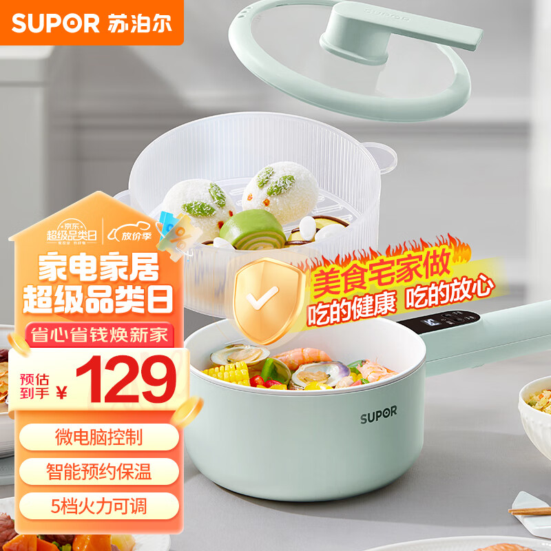苏泊尔 SUPOR 多功能锅 电煮锅电炒锅电蒸锅电火锅小电锅宿舍小锅 泡面锅 带蒸屉1.6L多用途锅H20YC841A价格:129.00元!
