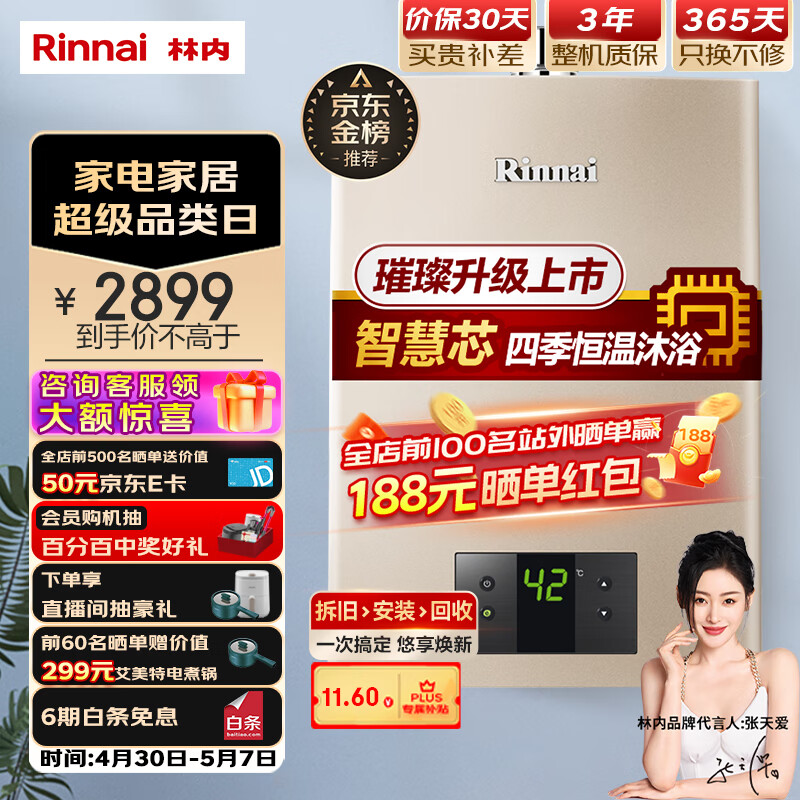 林内(Rinnai)璀璨系列16升燃气热水器 升级智慧芯 水气双调 天然气12T RUS-16QC05(JSQ31-C05)价格:2898.99元!