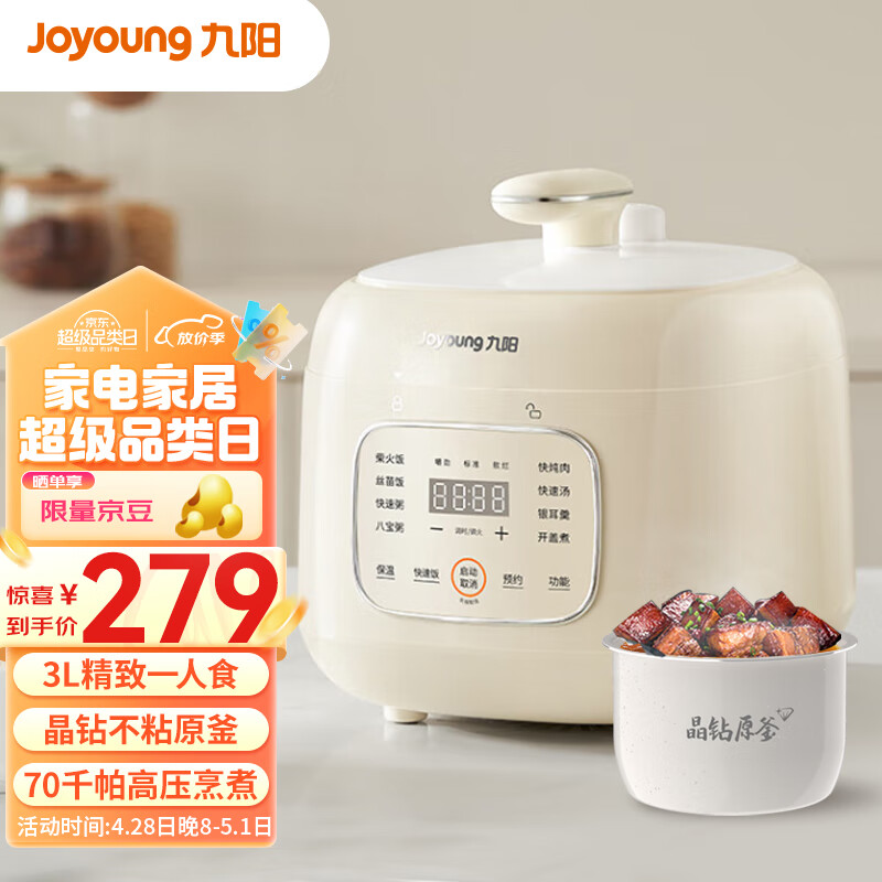 九阳(Joyoung)3L精致小容量电锅电煲一键排气多功能菜单晶钻原釜内胆优雅奶油白3升30H25价格:329.00元!