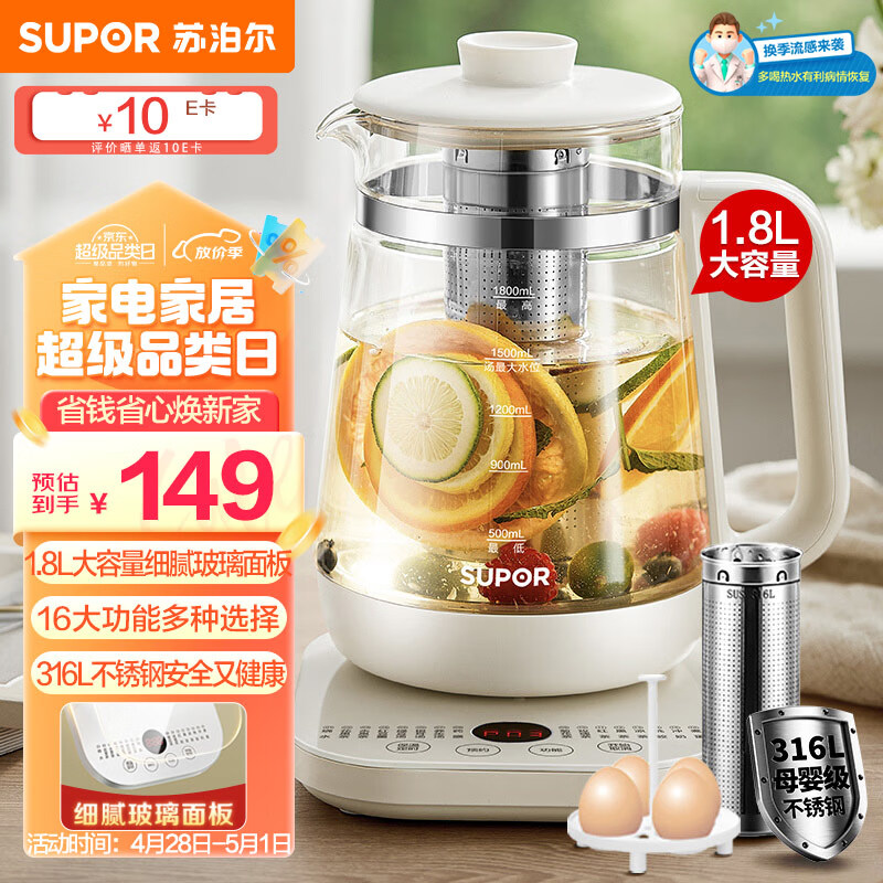 苏泊尔(SUPOR)1.8L大容量养生壶 煮茶器煮茶壶 316L不锈钢电水壶 保温花茶壶烧水壶 玻璃面板带滤网 SW-18YJ38价格:149.00元!