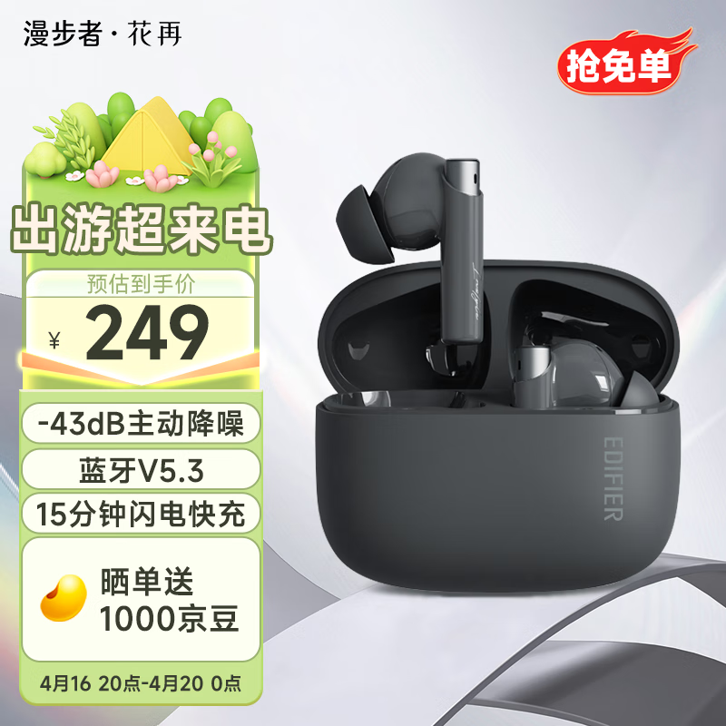 漫步者花再Zero Pro 无线主动降噪蓝牙耳机 入耳式耳机 无线游戏音乐耳机 长续航 适用苹果安卓华为小米 慕灰价格:249.00元!