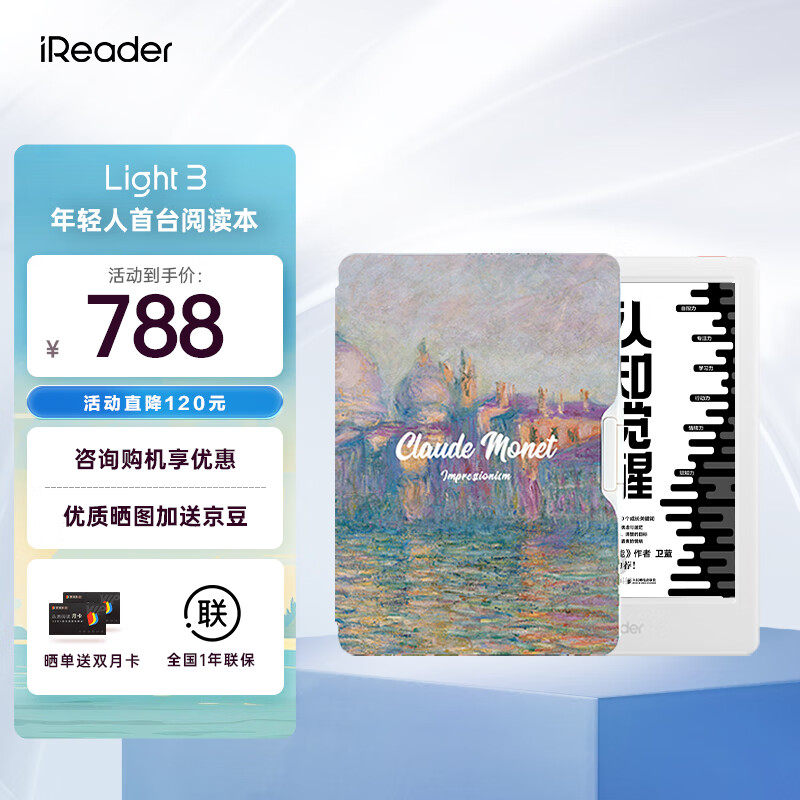 掌阅iReader Light3智能阅读本 电子书阅读器 6英寸墨水屏电纸书 32G 沉墨 莫奈运河·翻页键套装价格:788.00元!