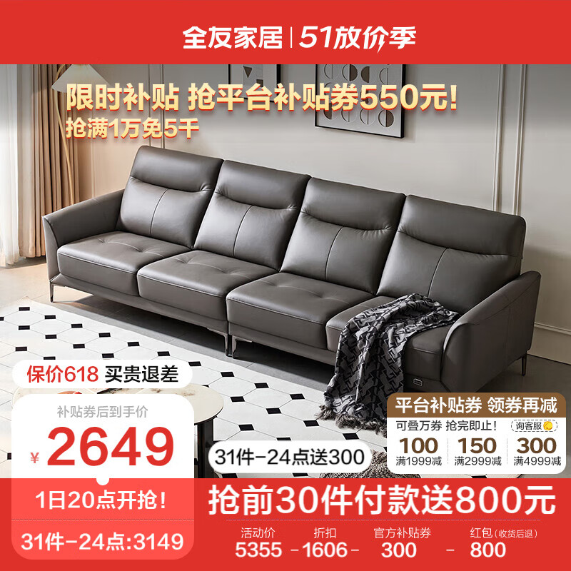 全友家居 真皮沙发客厅现代简约小户型直排式四人位皮艺沙发102710E价格:5355.71元!