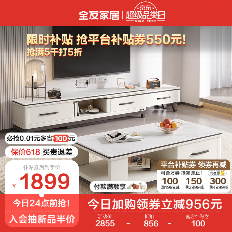 全友家居 茶几电视柜 简约北欧小户型客厅岩板台面茶几电视柜 120709C价格:2855.71元!