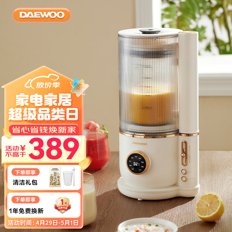 大宇(DAEWOO)静柔音破壁机家用豆浆机预约加热全自动免手洗搅拌机早餐机料理机 48分贝低音 FP01奶糖白价格:389.00元!