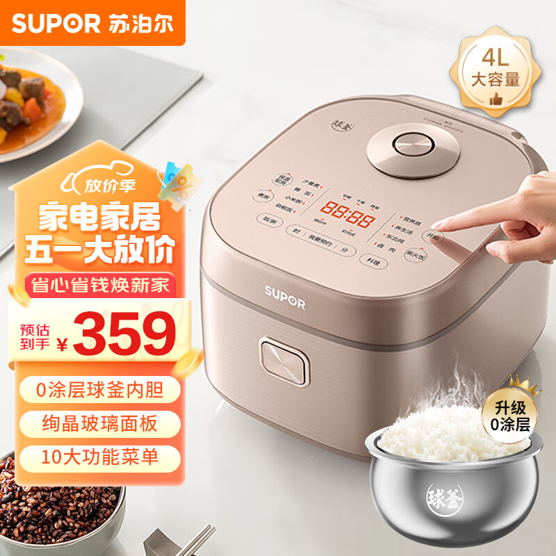 苏泊尔(SUPOR)0涂层4L不锈钢内胆2-6人电饭煲电饭锅 750W大火力家用智能多功能无涂层电饭煲SF40FC699价格:359.00元!