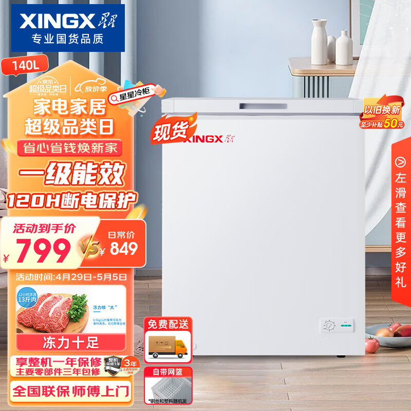星星(XINGX) 140升 家用囤货小冰柜 冷冻冷藏转换冷柜 单温母婴母乳小型冰箱 门锁 顶开门 BD/BC-140E价格:799.00元!
