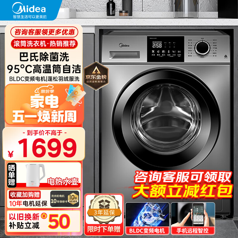 美的(Midea)滚筒洗衣机全自动10公斤大容量 一级变频节能 巴氏除菌洗 WIFI智控 除菌除螨 MG100VC133WY价格:1631.00元!