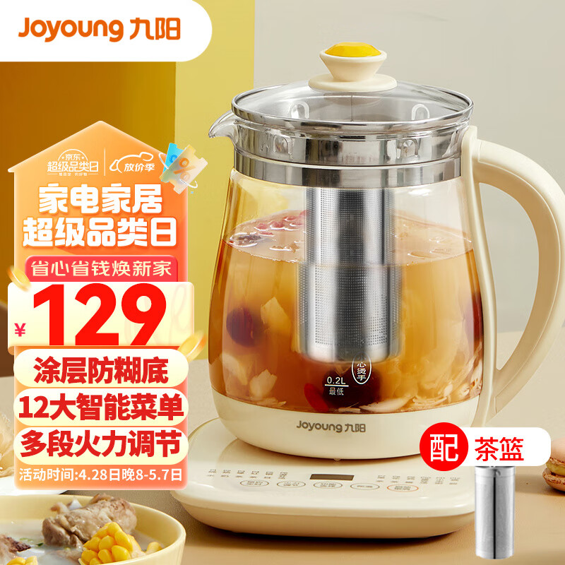 九阳(Joyoung)养生壶玻璃花茶壶 12大功能 1.5L专注炖煮 防糊底 电热水壶 K15F-WY175(茶)价格:139.00元!