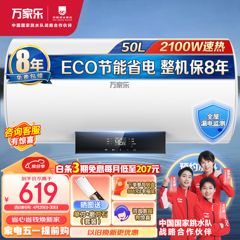 万家乐电热水器50升 储水式ECO节能速热 2100W触控大屏 预约加热 高温灭菌D50-CY3价格:616.00元!