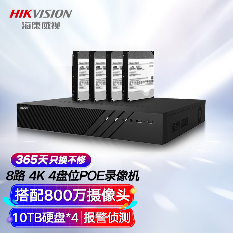 海康威视网络硬盘录像机监控8路POE网线供电NVR满配8个摄像头带4块10T硬盘DS-7908N-R4/8P价格:11625.00元!