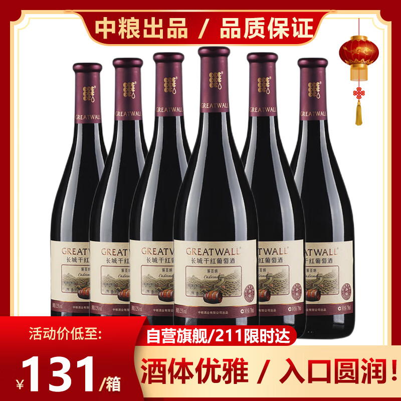 长城(GreatWall)红酒 御秘橡木桶陈酿解百纳葡萄酒750ML*6瓶整箱装(原箱包装)价格:131.00元!