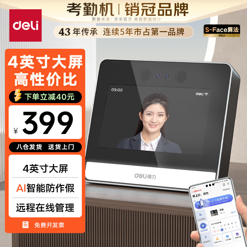 得力智能云考勤机 动态人脸识别打卡机 wifi联网 在线管理 实时查看考勤 防照片视频打卡 DL-D5S价格:459.00元!