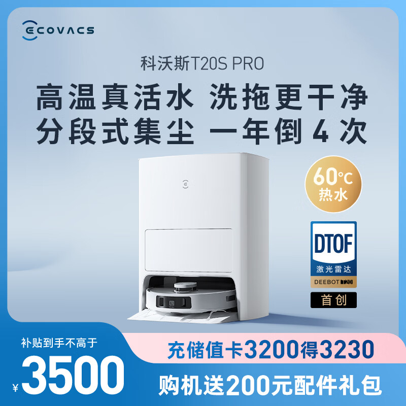 科沃斯(ECOVACS)扫地机器人扫拖一体T20S PRO基站自动清洗集尘 60°C热水洗拖布擦地烘干补水拖地贴边擦地价格:3500.00元!