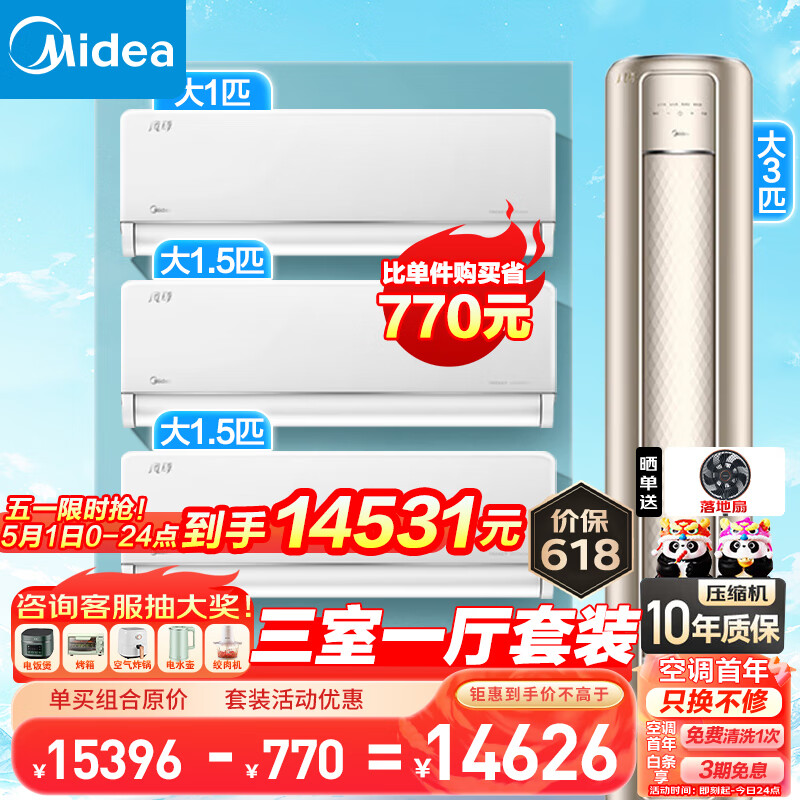 美的(Midea)风尊空调套装三室一厅一套购齐 新一级能效 变频挂机柜机 立式空调 以旧换新 3匹柜机+风尊时尚版价格:14531.00元!