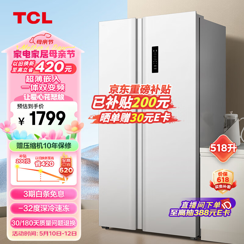TCL 518升大容量养鲜对开双开门白色冰箱一级能效双变频风冷无霜-32深冷速冻超薄家用冰箱R518V5-S价格:1799.00元!